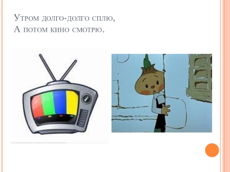 Слайд 5Утром долго-долго сплю, А потом кино смотрю.