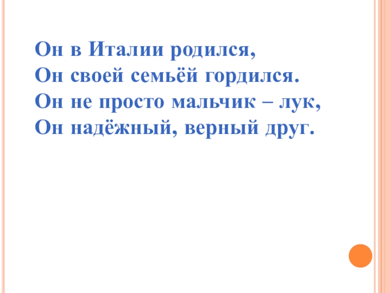 Он в Италии родился,Он своей семьёй гордился.Он не просто мальчик – лук,Он надёжный, верный друг.