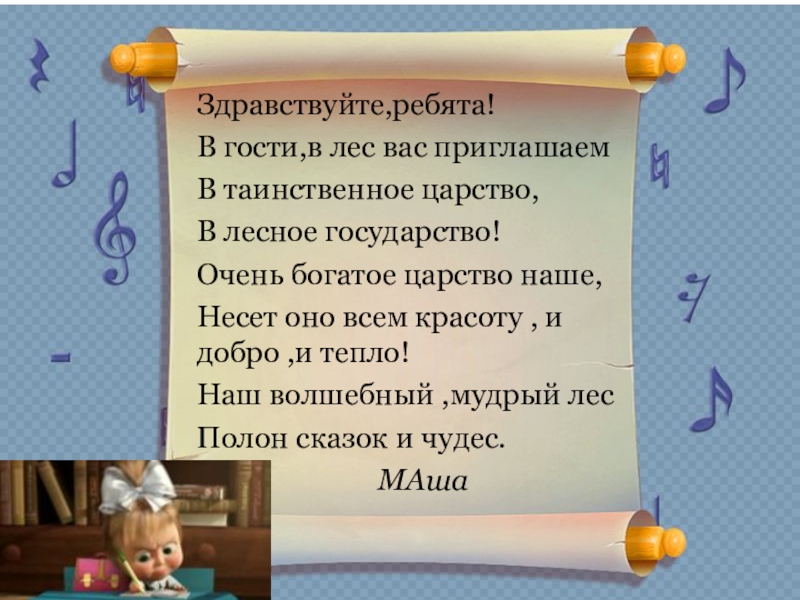 Здравствуйте,ребята!В гости,в лес вас приглашаемВ таинственное царство,В лесное государство!Очень богатое царство наше,Несет оно всем красоту , и добро ,и тепло!Наш волшебный ,мудрый лесПолон сказок и чудес.