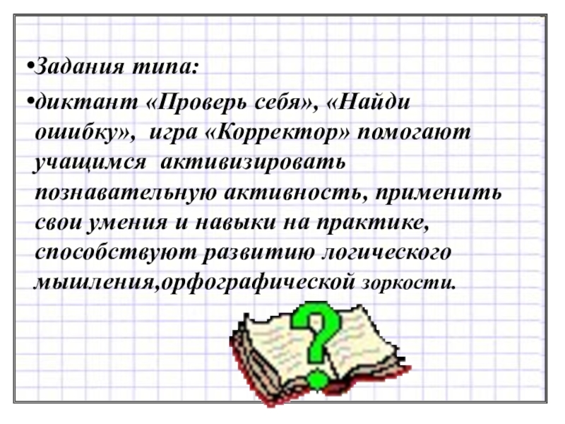активизировать познавательную активность, применить свои умения и навыки на практике, способствуют развитию логического мышления,орфографической зоркости.