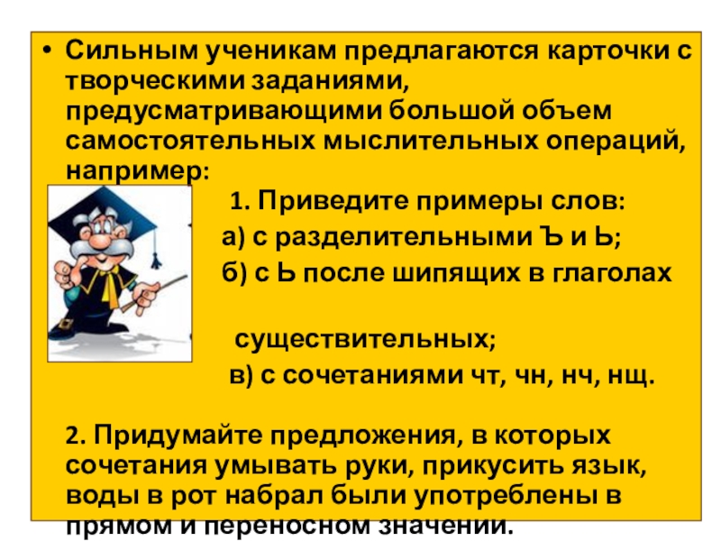 Слайд 15Сильным ученикам предлагаются карточки с творческими заданиями, предусматривающими большой объем самостоятельных