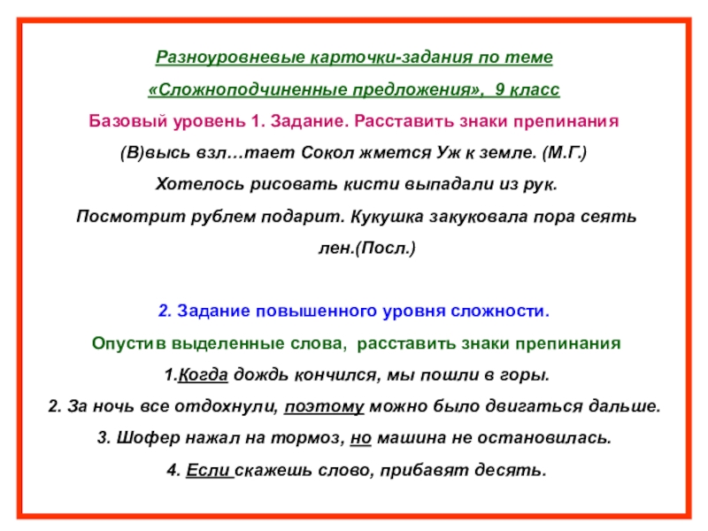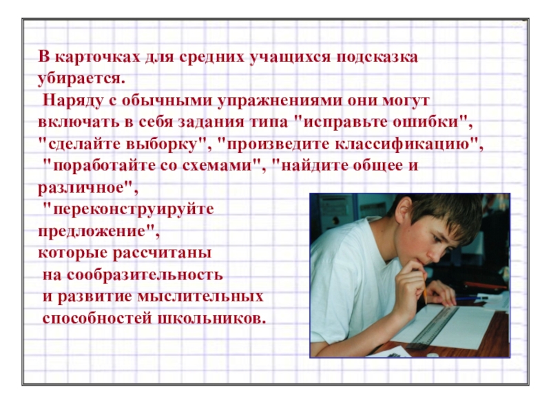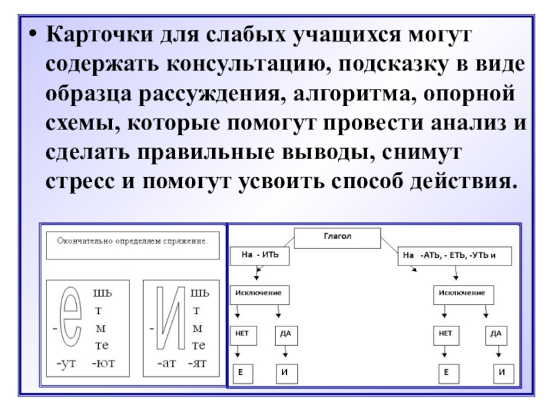 Слайд 13Карточки для слабых учащихся могут содержать консультацию, подсказку в виде образца