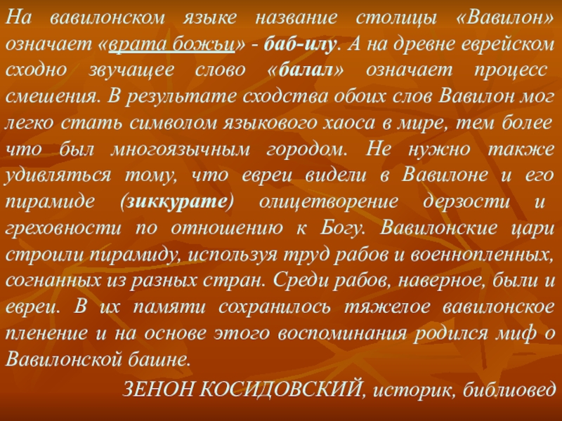 А на древне еврейском сходно звучащее слово «балал» означает процесс смешения. В результате сходства обоих слов Вавилон мог легко стать символом языкового хаоса в мире, тем более что был многоязычным городом. Не нужно также удивляться тому, что евреи видели в Вавилоне и его пирамиде (зиккурате) олицетворение дерзости и греховности по отношению к Богу. Вавилонские цари строили пирамиду, используя труд рабов и военнопленных, согнанных из разных стран. Среди рабов, наверное, были и евреи. В их памяти сохранилось тяжелое вавилонское пленение и на основе этого воспоминания родился миф о Вавилонской башне.