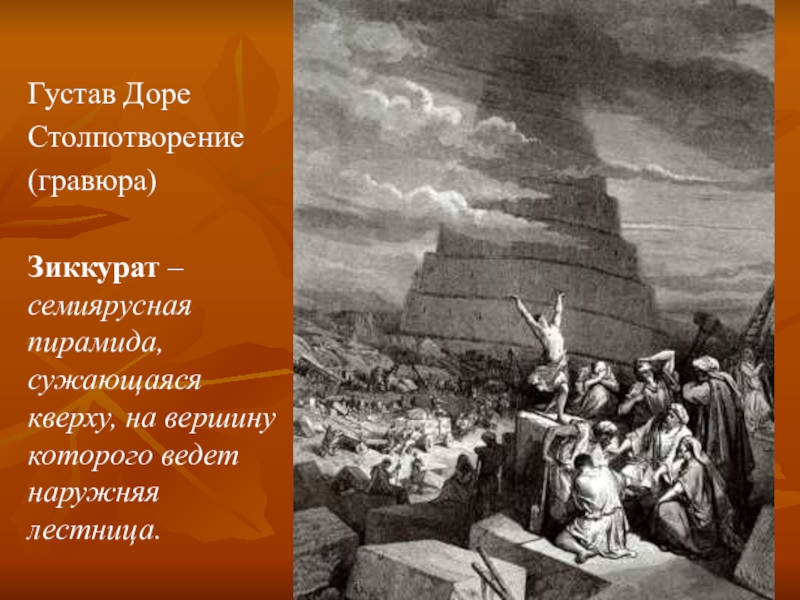 Густав ДореСтолпотворение(гравюра)Зиккурат – семиярусная пирамида, сужающаяся кверху, на вершину которого ведет наружняя лестница.