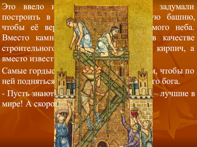 Слайд 3Это ввело их в гордыню и люди задумали построить в Вавилоне