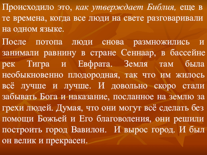 Происходило это, как утверждает Библия, еще в те времена, когда все люди на свете разговаривали на одном языке. После потопа люди снова размножились и занимали равнину в стране Сеннаар, в бассейне рек Тигра и Евфрата. Земля