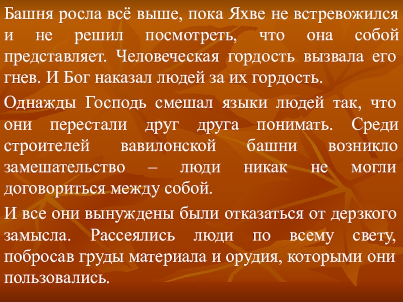Слайд 4Башня росла всё выше, пока Яхве не встревожился и не решил