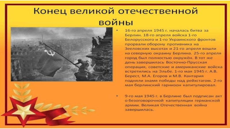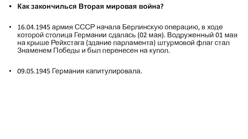 Как закончилься Вторая мировая война?16.04.1945 армия СССР начала Берлинскую операцию, в ходе которой столица Германии сдалась (02