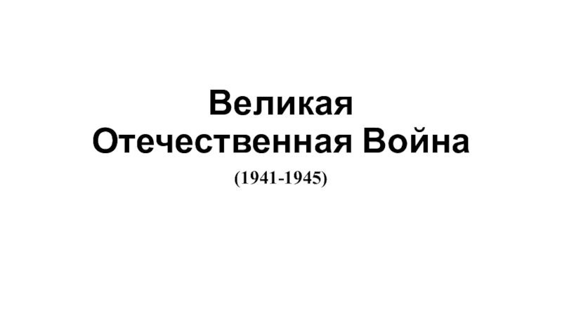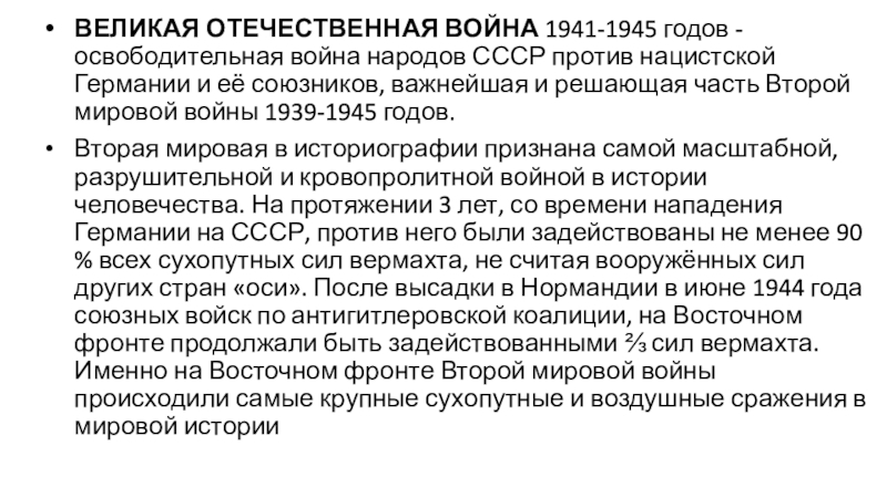 ВЕЛИКАЯ ОТЕЧЕСТВЕННАЯ ВОЙНА 1941-1945 годов - освободительная война народов СССР против нацистской Германии и её союзников, важнейшая и решающая часть Второй мировой войны 1939-1945 годов.Вторая мировая в историографии признана самой масштабной, разрушительной и кровопролитной войной в