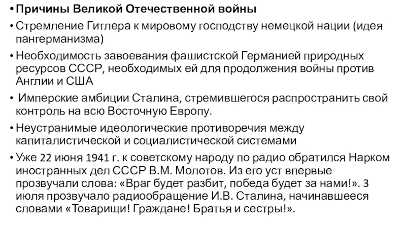Причины Великой Отечественной войныСтремление Гитлера к мировому господству немецкой нации (идея