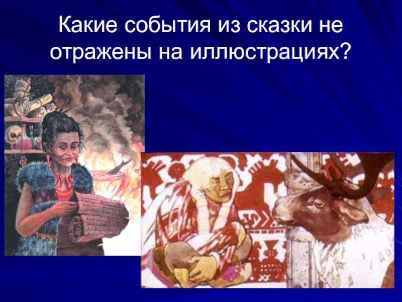 Слайд 5Какие события из сказки не отражены на иллюстрациях?