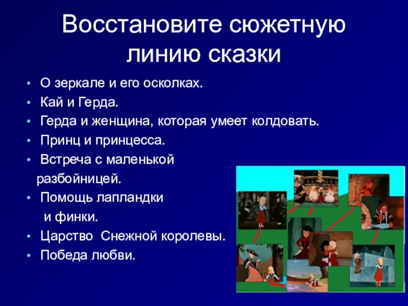 Восстановите сюжетную линию сказкиО зеркале и его осколках.Кай и Герда.Герда и женщина, которая умеет колдовать.Принц и принцесса.Встреча
