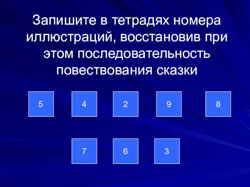 Слайд 3Запишите в тетрадях номера иллюстраций, восстановив при этом последовательность повествования сказки
