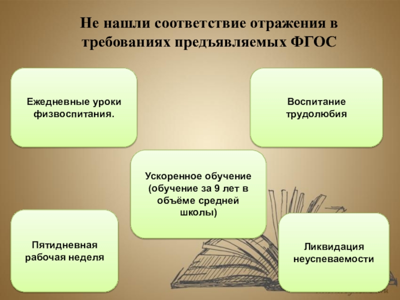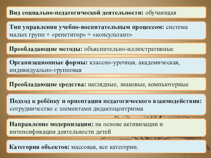 Характер содержания: светский, общеобразовательный, технократический, жёстко-стандартный, дидактоцентрический, монотехнологический