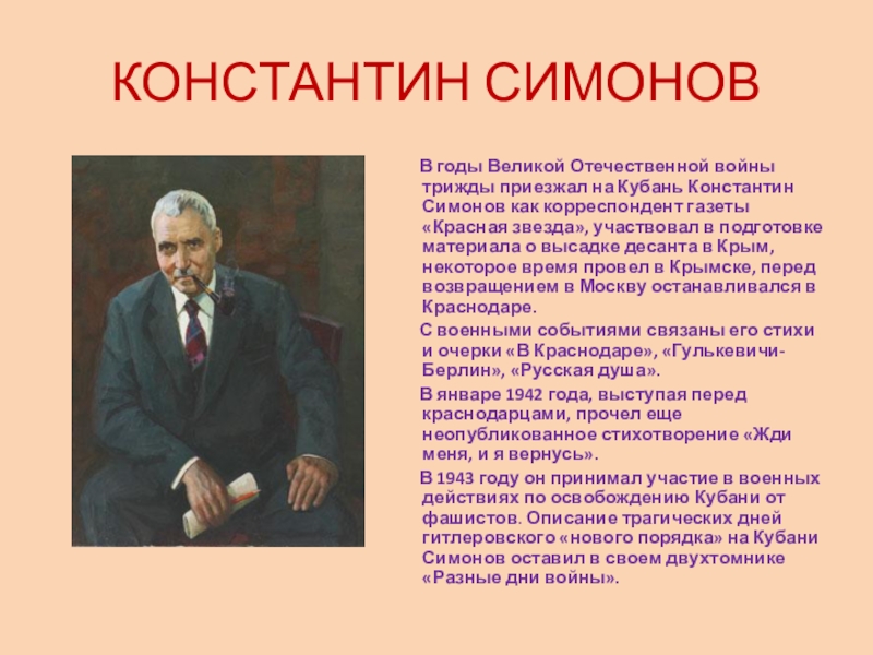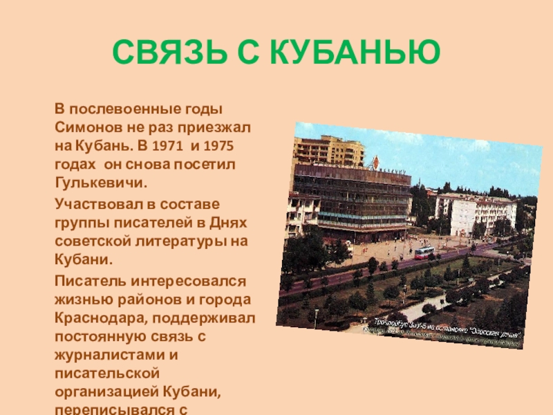 приезжал на Кубань Константин Симонов как корреспондент газеты «Красная звезда», участвовал в подготовке материала о высадке десанта в Крым, некоторое время провел в Крымске, перед возвращением в Москву останавливался в Краснодаре.