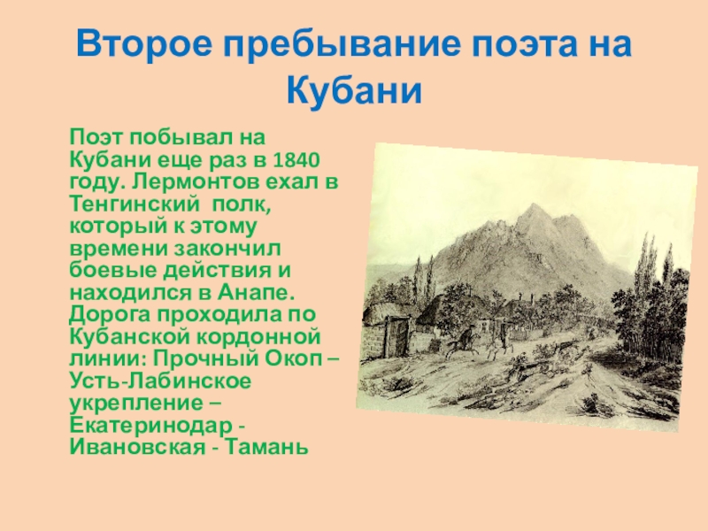 он проезжал в 1820-м. В письме к брату писал: «Видел я брега Кубани и сторожевые станицы, любовался нашими казаками: вечно верхом, вечно готовы драться, в вечной предосторожности»