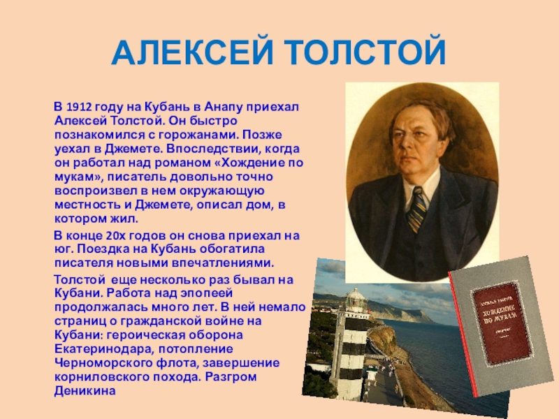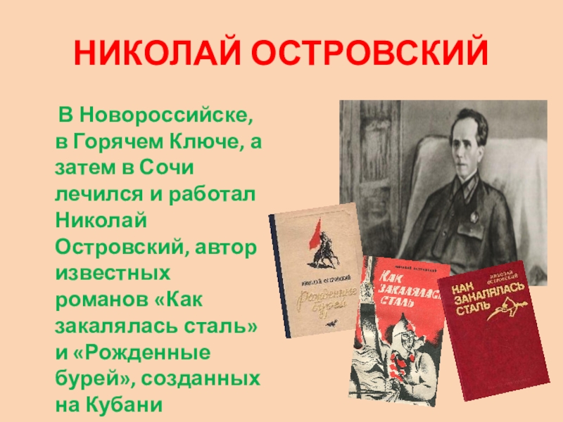 в Сочи лечился и работал Николай Островский, автор известных романов «Как закалялась сталь» и «Рожденные бурей», созданных на Кубани
