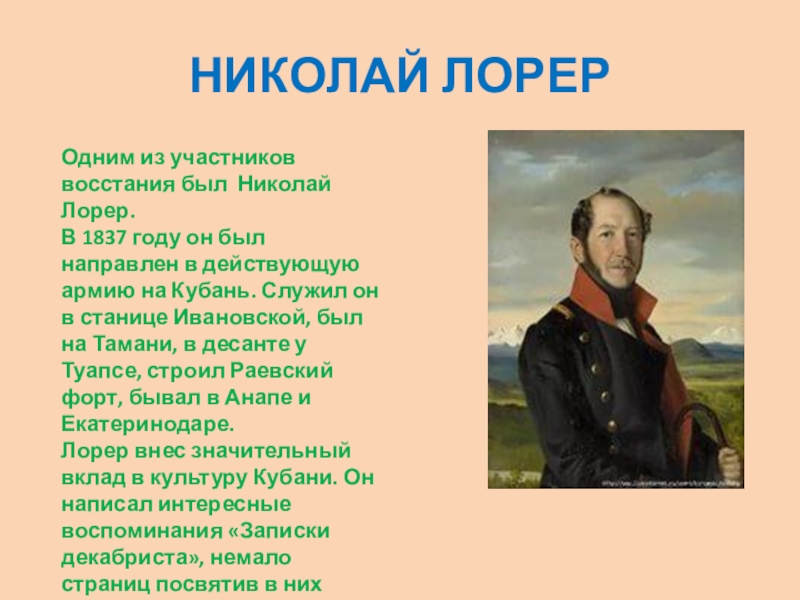 Одним из участников восстания был Николай Лорер.