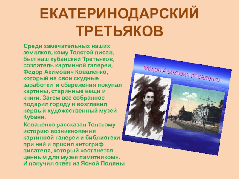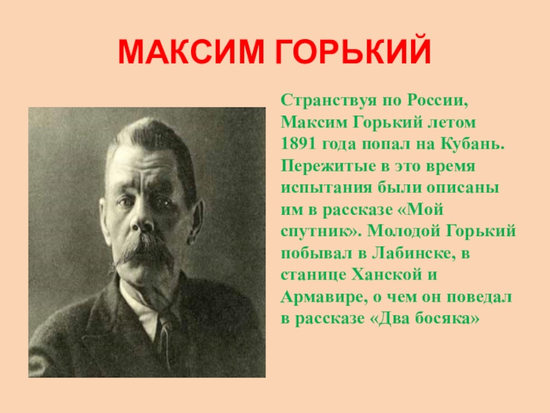 С Кубанью связаны 10 лет жизни писателя. В своих произведениях он обращался к людям и проблемам того времени, в письмах вспоминал годы, проведенные в нашем крае.