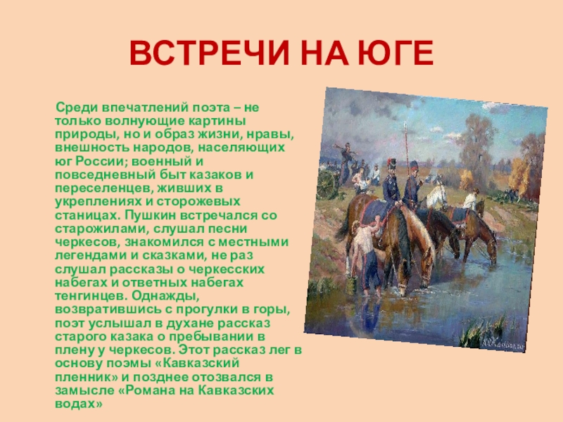 только волнующие картины природы, но и образ жизни, нравы, внешность народов, населяющих юг России; военный и повседневный быт казаков и переселенцев, живших в укреплениях и сторожевых станицах. Пушкин встречался со старожилами, слушал песни черкесов, знакомился с местными легендами и сказками, не раз слушал рассказы о черкесских набегах и ответных набегах тенгинцев. Однажды, возвратившись с прогулки в горы, поэт услышал в духане рассказ старого казака о пребывании в плену у черкесов. Этот рассказ лег в основу поэмы «Кавказский пленник» и позднее отозвался в замысле «Романа на Кавказских водах»