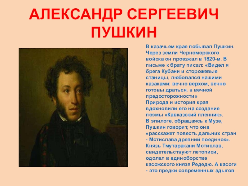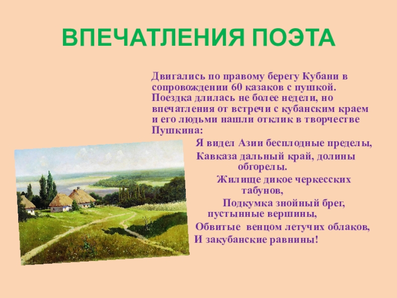 60 казаков с пушкой. Поездка длилась не более недели, но впечатления от встречи с кубанским краем и его людьми нашли отклик в творчестве Пушкина: