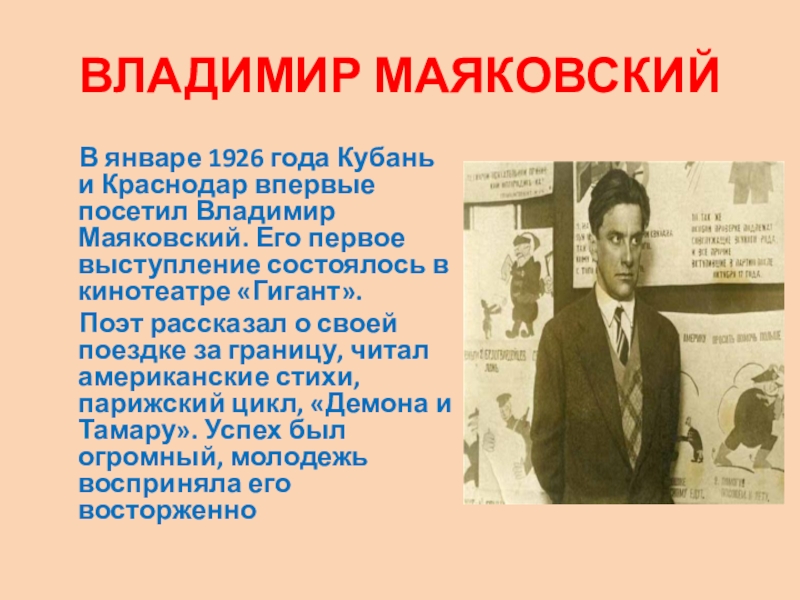 в феврале, Маяковский снова приехал в полюбившийся ему Краснодар с новыми стихами и был чрезвычайно поражен жаром кубанского солнца. Много гулял по городу, интересовался архитектурой, выступал в Зимнем театре