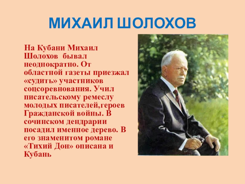 областной газеты приезжал «судить» участников соцсоревнования. Учил писательскому ремеслу молодых писателей,героев Гражданской войны. В сочинском дендрарии посадил именное дерево. В его знаменитом романе «Тихий Дон» описана и Кубань
