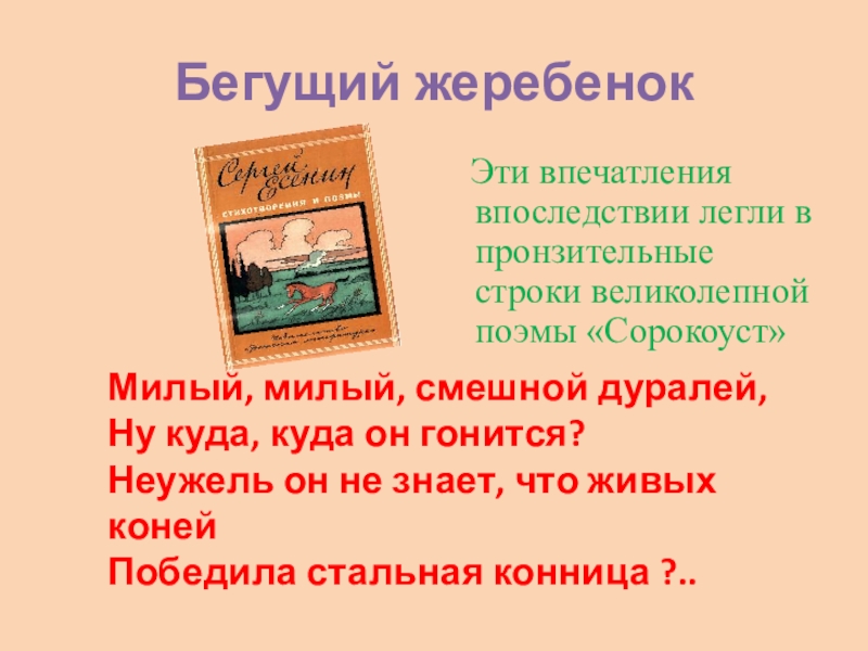 « Мы ехали от Тихорецкой на Пятигорск, вдруг … видим, за паровозом что есть силы скачет маленький жеребенок … он почему-то вздумал обогнать его… но под конец стал уставать…