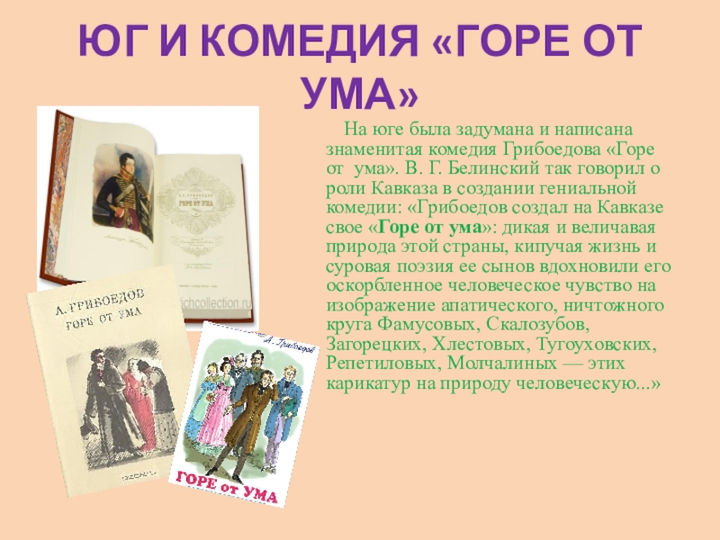 юге была задумана и написана знаменитая комедия Грибоедова «Горе от ума». В. Г. Белинский так говорил о роли Кавказа в создании гениальной комедии: «Грибоедов создал на Кавказе свое «Горе от ума»: дикая и величавая природа этой страны, кипучая жизнь и суровая поэзия ее сынов вдохновили его оскорбленное человеческое чувство на изображение апатического, ничтожного круга Фамусовых, Скалозубов, Загорецких, Хлестовых, Тугоуховских, Репетиловых, Молчалиных — этих карикатур на природу человеческую...»