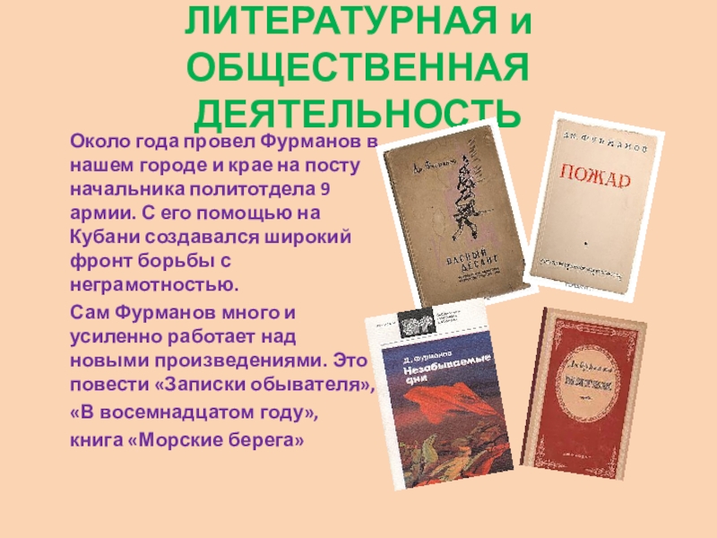 Сам Фурманов много и усиленно работает над новыми произведениями. Это повести «Записки обывателя»,