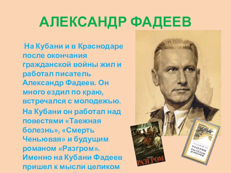 На Кубани он работал над повестями «Таежная болезнь», «Смерть Ченьювая» и будущим романом «Разгром». Именно на Кубани Фадеев пришел к мысли целиком посвятить себя литературному творчеству