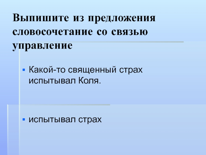 Выпишите из предложения словосочетание со связью управлениеКакой-то священный страх испытывал Коля.испытывал страх
