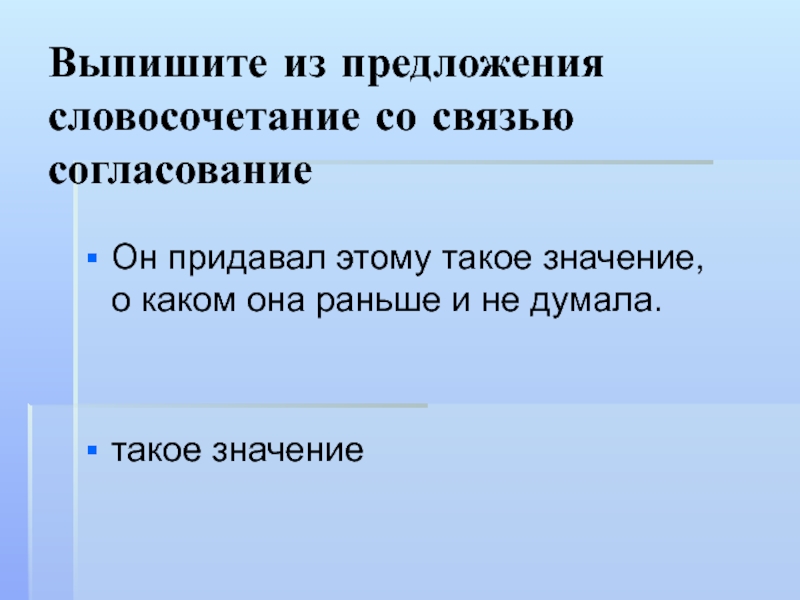 Выпишите из предложения словосочетание со связью согласованиеОн придавал этому такое значение, о каком она раньше и не