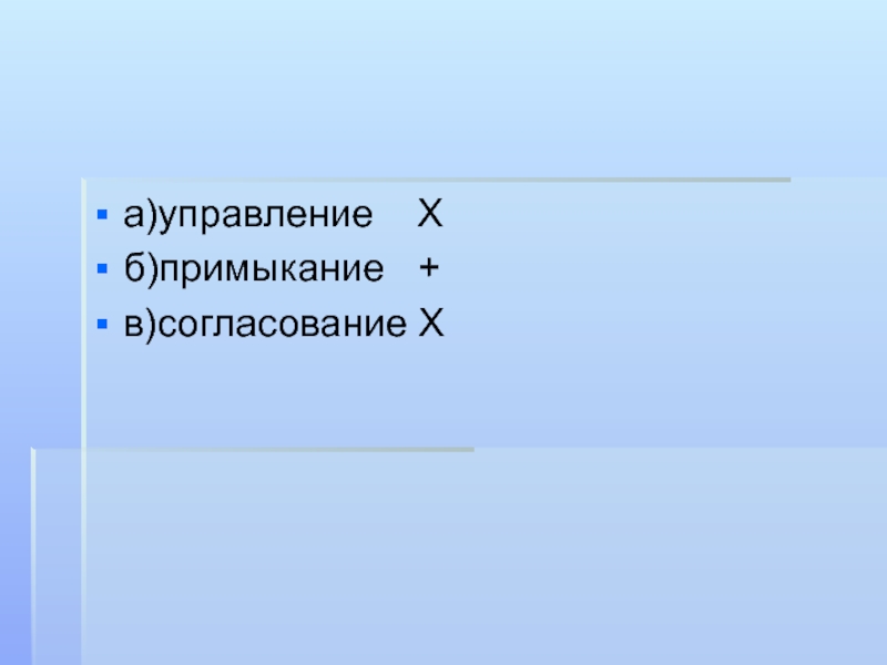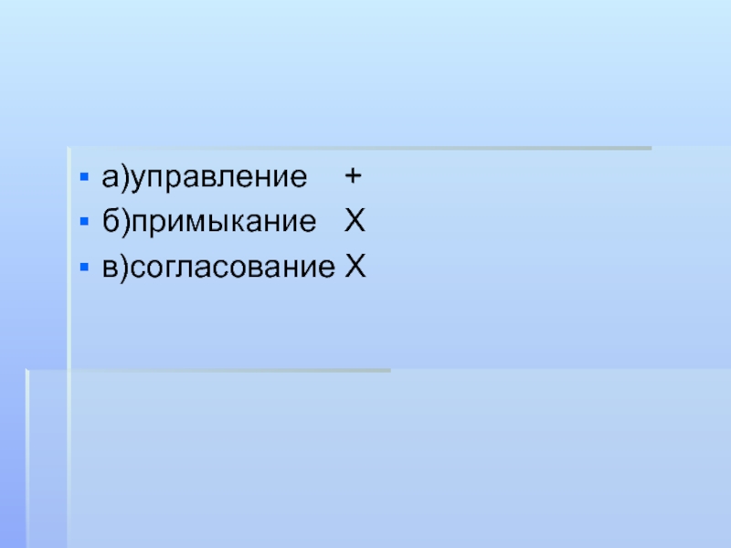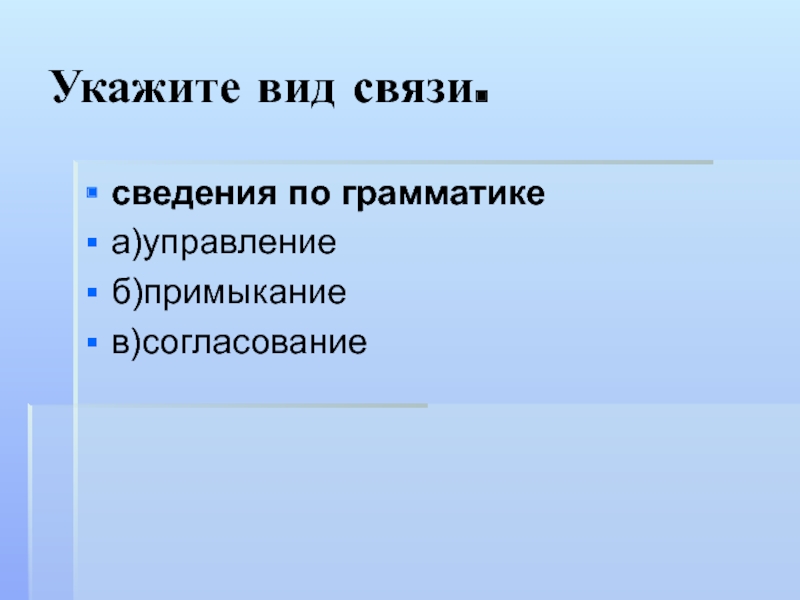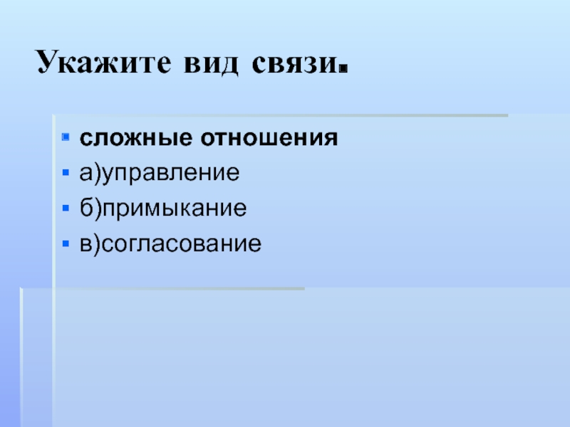 Укажите вид связи.сложные отношения а)управлениеб)примыканиев)согласование