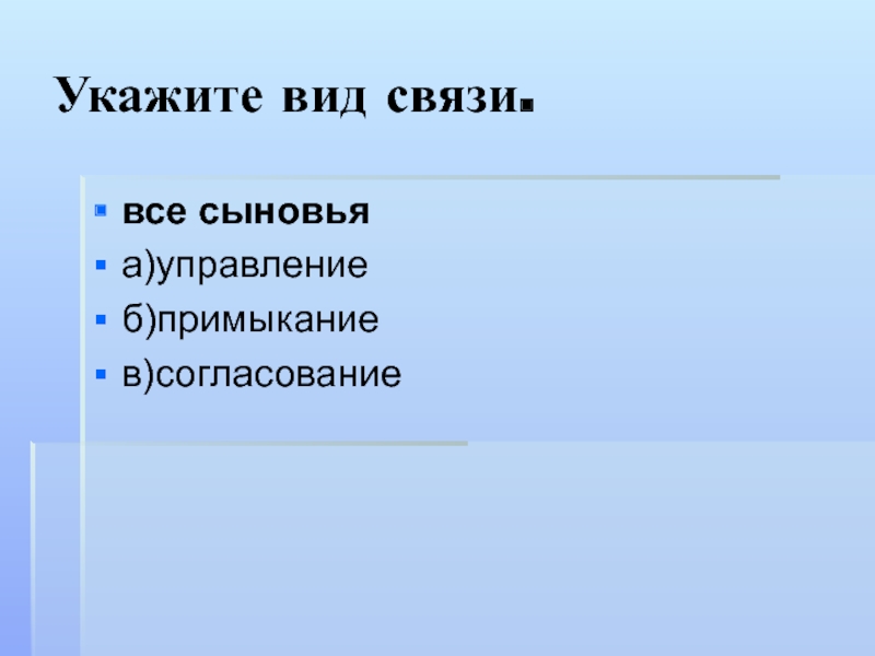 Укажите вид связи.все сыновья а)управлениеб)примыканиев)согласование