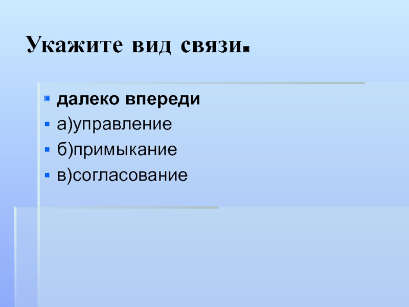 Укажите вид связи.далеко впереди а)управлениеб)примыканиев)согласование