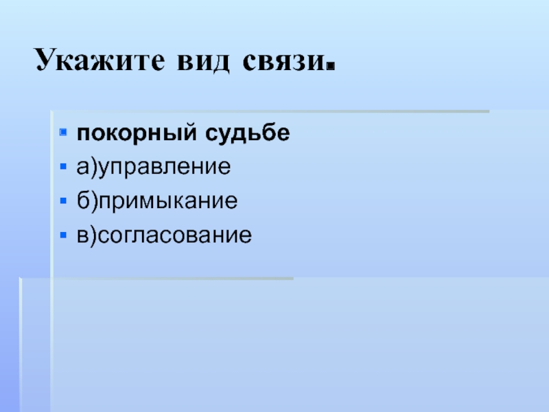 Укажите вид связи.покорный судьбе а)управлениеб)примыканиев)согласование