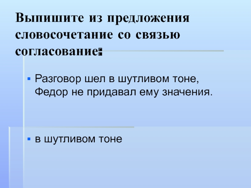 Выпишите из предложения словосочетание со связью согласование:Разговор шел в шутливом тоне, Федор не придавал ему значения.в шутливом