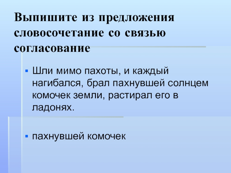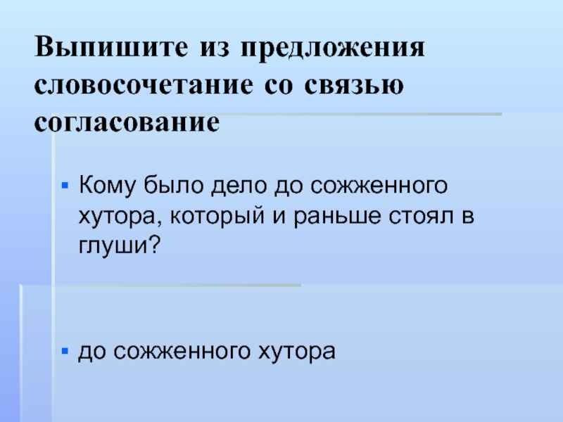 Слайд 8Выпишите из предложения словосочетание со связью согласование