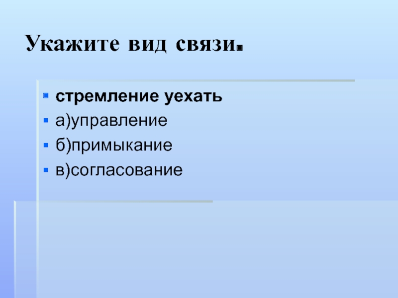 Укажите вид связи.стремление уехать а)управлениеб)примыканиев)согласование