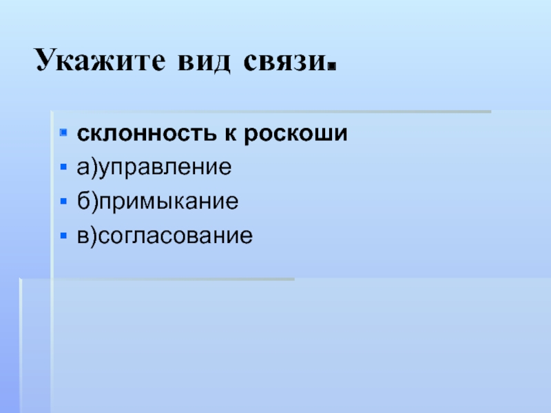 Укажите вид связи.склонность к роскоши а)управлениеб)примыканиев)согласование