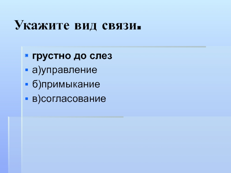 Укажите вид связи.грустно до слез а)управлениеб)примыканиев)согласование