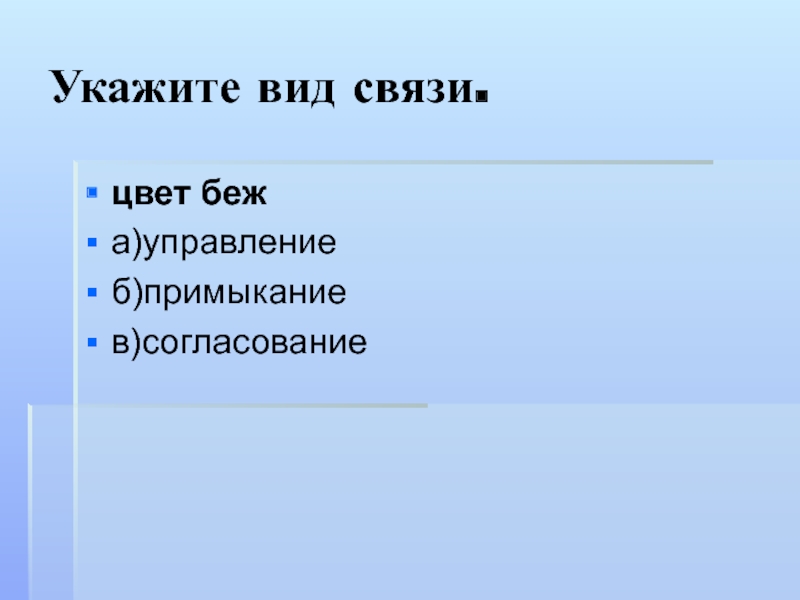 Укажите вид связи.цвет беж а)управлениеб)примыканиев)согласование