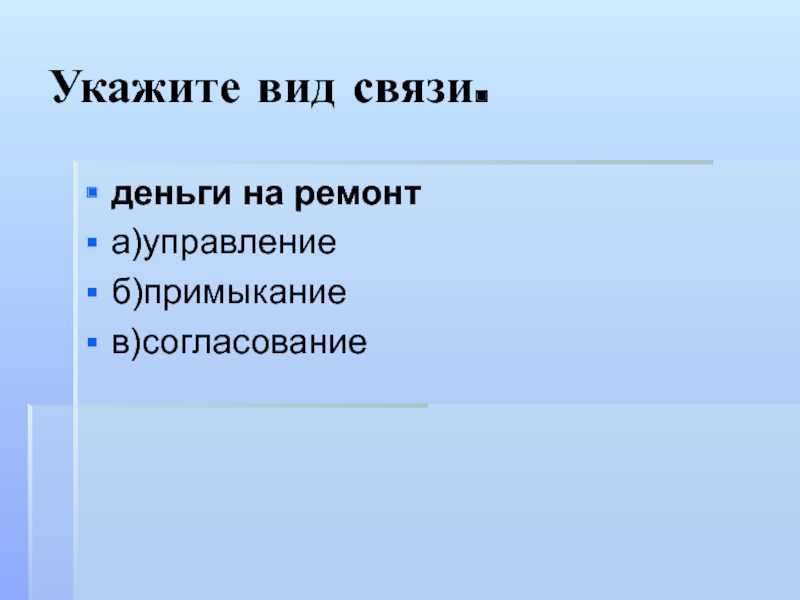 Укажите вид связи.деньги на ремонт а)управлениеб)примыканиев)согласование