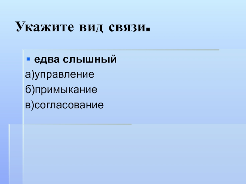 Укажите вид связи.едва слышный а)управлениеб)примыканиев)согласование