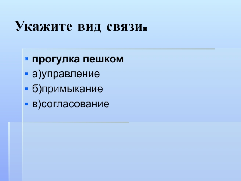 Укажите вид связи.прогулка пешком а)управлениеб)примыканиев)согласование