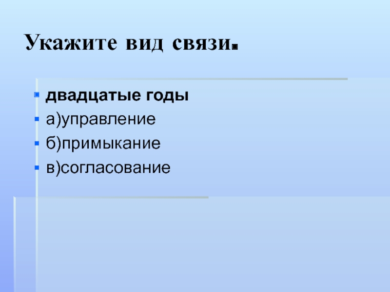 Укажите вид связи.двадцатые годы а)управлениеб)примыканиев)согласование