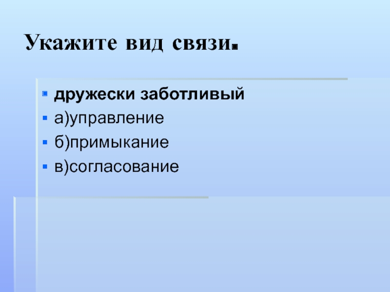 Укажите вид связи.дружески заботливый а)управлениеб)примыканиев)согласование