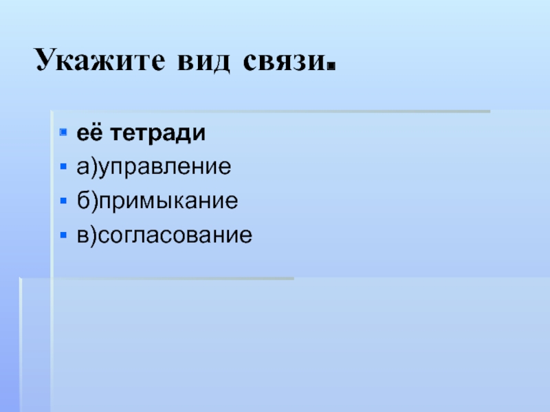 Укажите вид связи.её тетради а)управлениеб)примыканиев)согласование