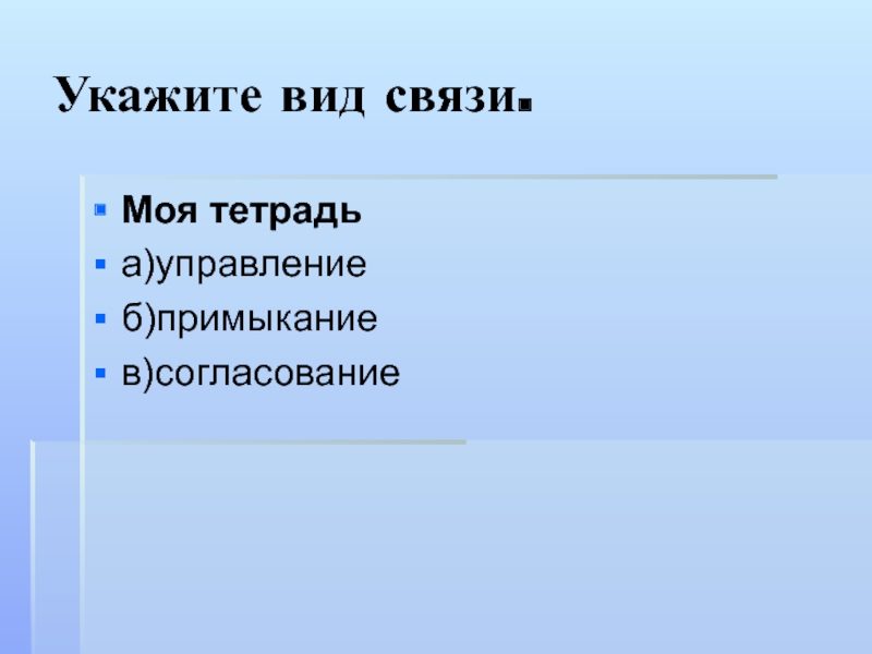 Укажите вид связи.Моя тетрадьа)управлениеб)примыканиев)согласование